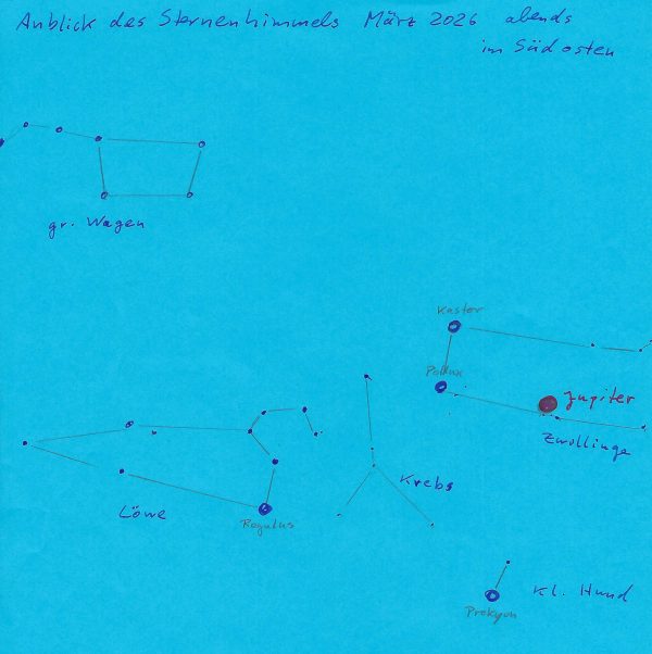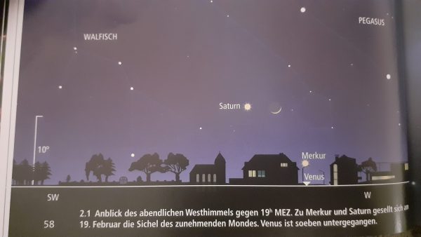 Diesen Februar gibt es wieder eine Chance den flinken Planeten Merkur zu „erwischen“, gegen Mitte des Monats ist die beste Abendsichtbarkeit des Jahres. Er ist ab 8.2. am Abendhimmel im Westen kurz nach Sonnenuntergang zu sehen, die besten Bedingungen sind am 19.2. Ab dem 24. ist er der Sonne zu nahe, es ist noch nicht dunkel genug ihn zu sehen, wenn er bereits untergeht.